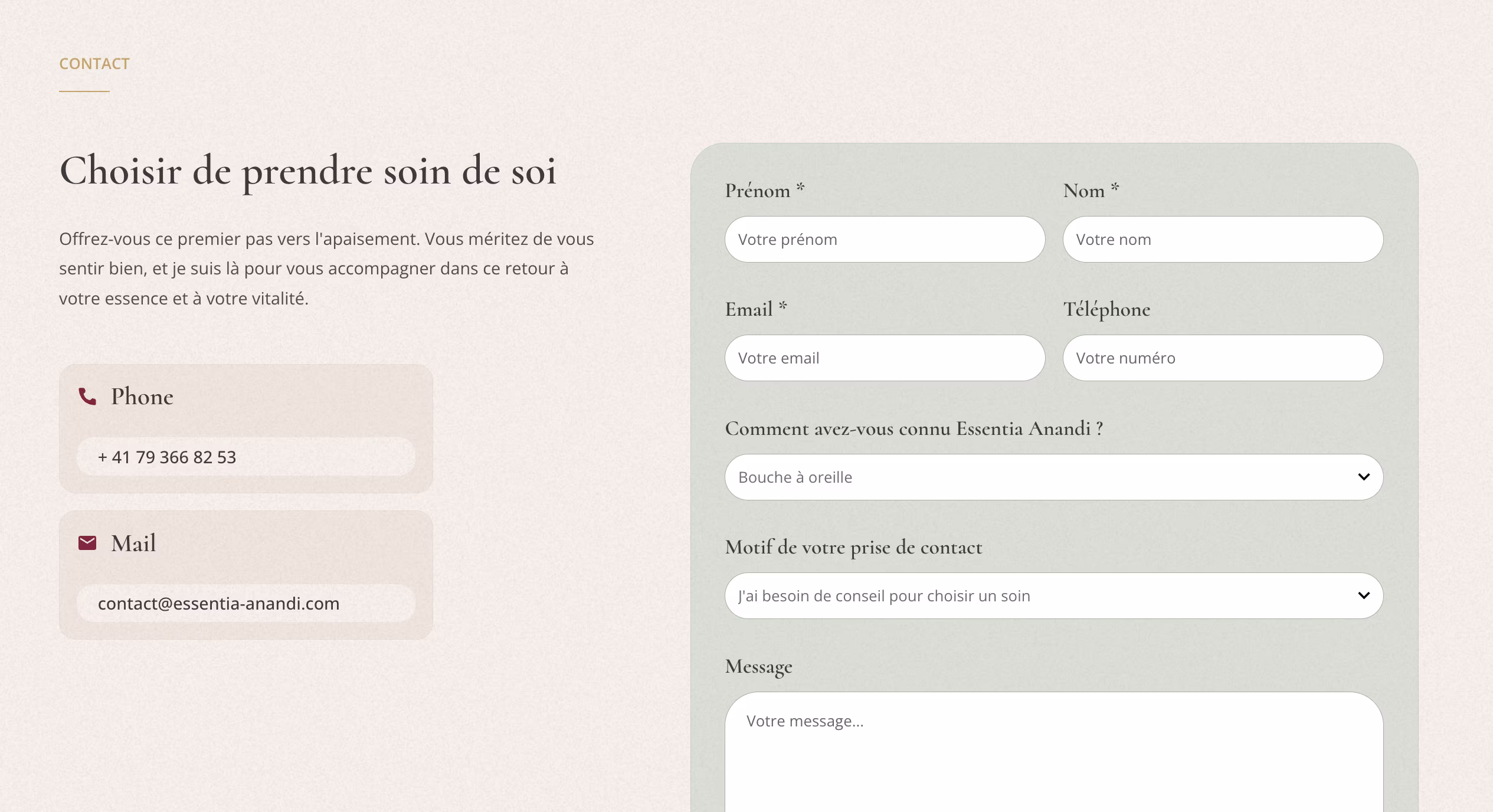 Ce projet a consisté en la création du tout premier site web d’Essentia Anandi, impliquant une réflexion sur l’architecture, les contenus et le parcours utilisateur. Le design UX/UI et le développement sur Webflow ont été réalisés en s’appuyant sur l’univers visuel déjà présent sur Instagram, afin d’assurer une continuité de marque harmonieuse.