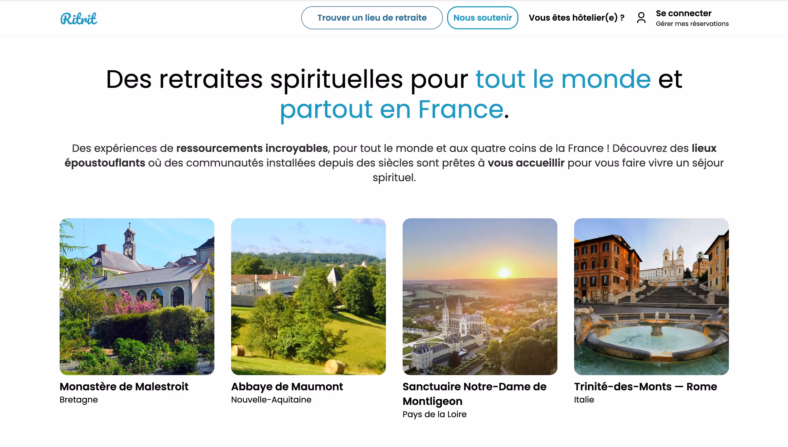 Ritrit est une plateforme de réservation de retraites spirituelles qui permet aux personnes de toutes confessions et de tous horizons de trouver la retraite qui leur convient. L'entreprise a été fondée en 2022 par un groupe de passionnés de spiritualité.